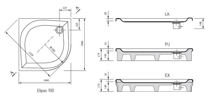 Исполнение: LA - душевой поддон низкий армированный ламинатом, предназначеный для установки в пол или на опорную конструкцию