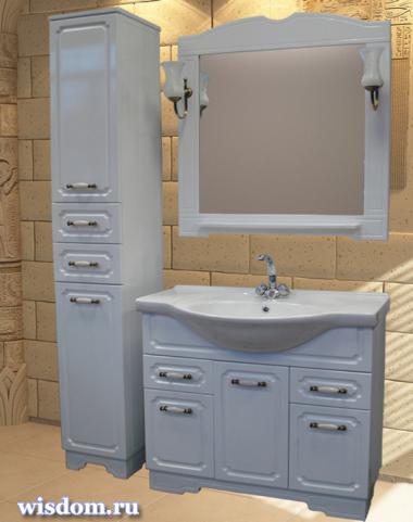 * Тумба оснащена тремя дверцами и двумя ящиками * Зеркало комплектуется двумя светильниками и полочкой * Особенности: декоративная резьба на дверцах, ручки стилизованы под слоновую кость * Глубокая раковина с дополнительными плоскостями под ванные принадлежности по бокам * Фурнитура с доводчиками * Материал фасада: МДФ 19 * Покрытие фасада: эмаль, пленка * Материал корпуса: ДСП 16 * Цвет: белый глянец