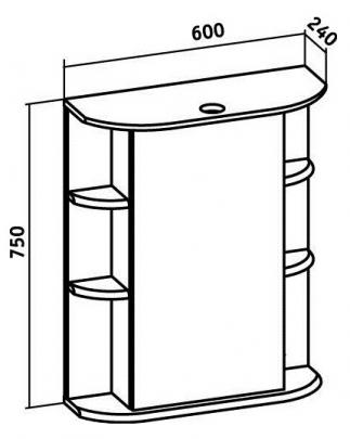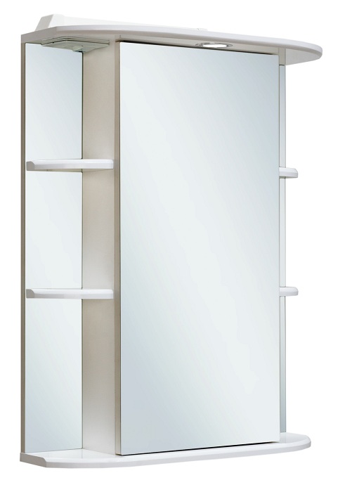 арт. Вн Ш8 Runo - Зеркальный шкаф Гиро 60  белый, правый *с одной дверцей и боковыми полками *материал корпуса: ДСП *материал фасада: МДФ  Шкаф оборудован трансформатором мощностью 60 Вт для подключения галогенных светильников со скрытым подключением электропровода, выключателем и розеткой.