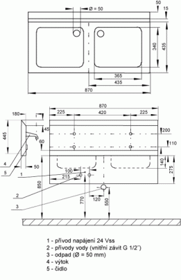 SLUN 07E - арт. № 93071 - нержавеющая двойная мойка с интегрированной электроникой и плечом вытекания, электромагнитный клапан (2 шт), соединительный шланг, угловой вентиль с фильтром и обратным клапаном (2 шт.), сифон, крепежный комплект