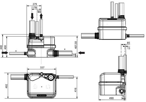 *возможное подключение: сточные воды от унитазов, использованные воды от ванных комнат, кухни, прачечной *откачивание по вертикали: до 11 м *откачивание по горизонтали: до 100 м *диаметр труб входа: - использованные воды: 40/50 мм - сточные воды: 100/110 мм *диаметр труб откачивания: 50 мм *рабочая температура: 35°С, максимальная 70°С *объем: 47 л *напряжение: 220–240 В / 50 Гц *потребляемая мощность: 2х1500 Вт *размеры (ДхГхВ): 557х491х408 мм