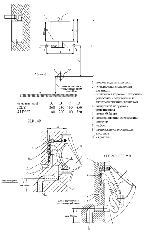SLP 26RZ – арт. № 01265, SLP 27RZ – арт. № 01275 керамический писсуар со встроенным радарным устройством смыва; монтажная пластмассовая коробка с латунным резьбовым соединением, встроенным источником питания, электромагнитным клапаном и шаровым вентилем; выпускной патрубок с уплотнением; сифон; крепежный комплект