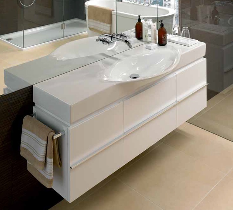 *1 выдвижной ящик *2 распашные дверцы *корпус/ фасад: МДФ с ПВХ-пленкой *встроенная ручка в верхней части тумбы *алюминиевая ручка в центре тумбы *2 стеклянные полки *вес: 36,5 кг *цвет белый *подходит для раковин Laufen Palace 1170.4 и Palace 1270.4