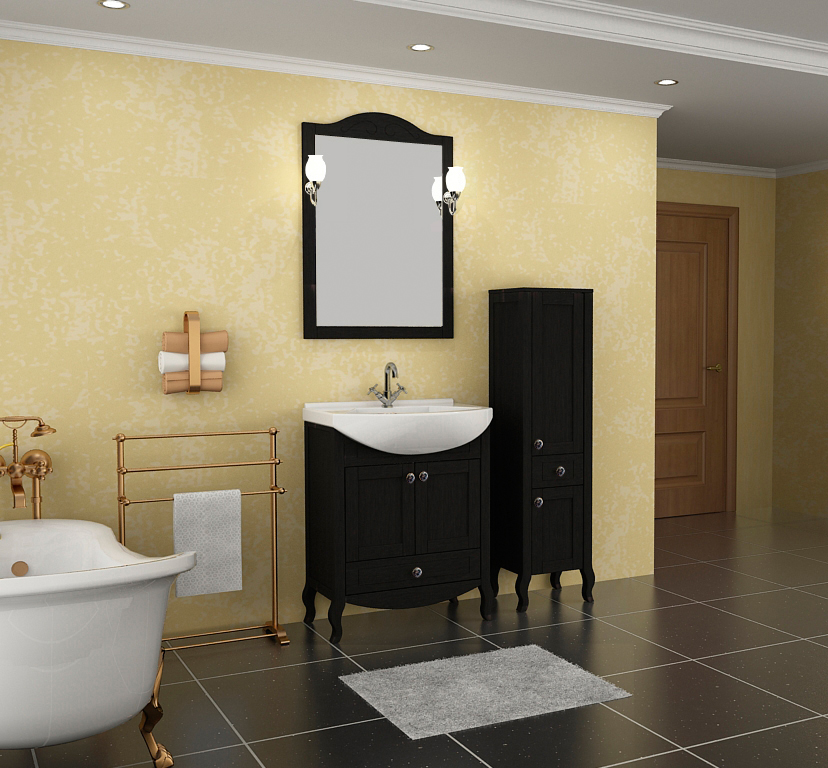 * Тумба оснащена двумя дверцами и одним ящиком * Зеркало комплектуется светильниками и полочкой * В мебели используется европейская фурнитура, дверки с доводчиками и ящик полного выдвижения также с доводчиком * Материал фасада и корпуса: массив ясеня * Покрытие фасада: патина, лак * Фурнитура: хром * Цвет: черный