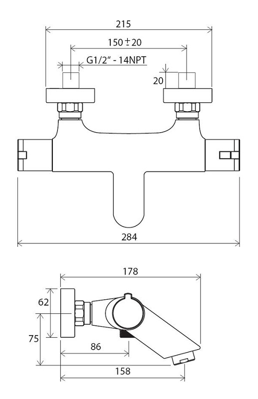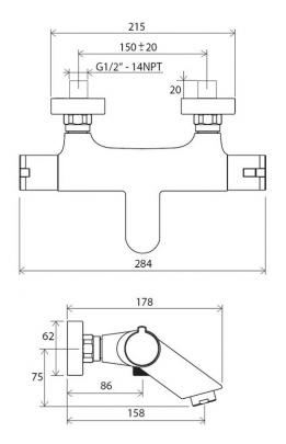 * керамический картридж для регулирования напора воды и термостатический картридж для регулирования температуры воды * корпус смесителя изготовлен из латуни и покрыт хромом * оснащен регулятором напора воды с указателями положения <<душ-Off-ванна>> * правый регулятор температуры воды с нанесенной разметкой горячая/холодная вода * блокировка температуры воды - настроена максимально на 38`C * межосевой размер - 150 мм, без лейки