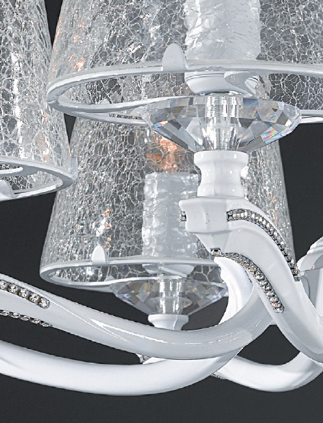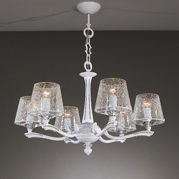 Люстра La Lampada Moderno L.161/6.07 Размеры, мм: H500 Ø750 Тип лампы: накаливания Е14 Количество ламп, шт: 6 Мощность лампы, Вт: 60 Материал светильника: металл/стекло кракле/цепочки Сваровски Цвет светильника: белый Стиль: модерн