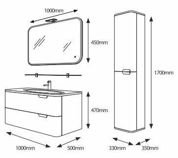 * Тип: подвесной, с вмонтированными регулируемыми навесами на тумбе и пенале