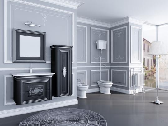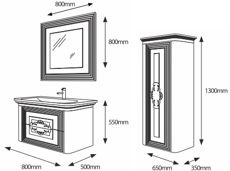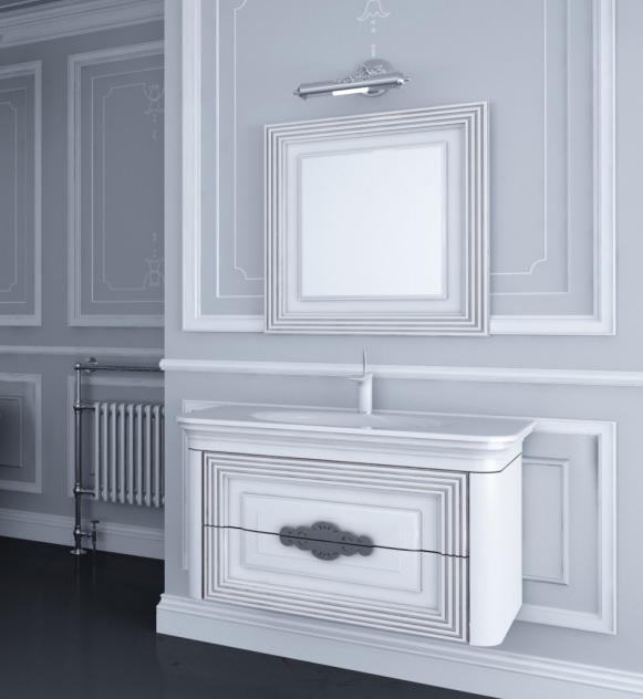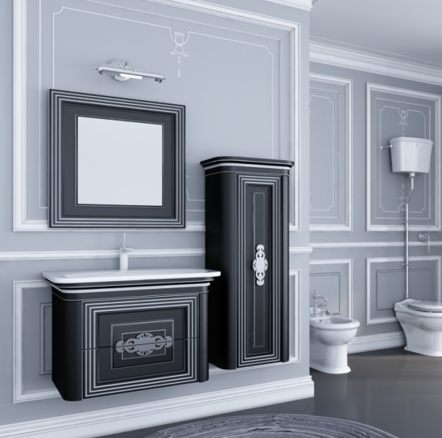 Комплект мебели Botticelli Trevizo 80 воплощает в себе универсальность и бессменную актуальность классического стиля. В то же время сдержанность и строгость цветовой гаммы выгодно сочетается с легкостью и невесомостью контуров. Модель выпускается в двух версиях: черный матовый корпус и фасад с патиной серебра, белый матовый корпус и фасад с патиной меди.