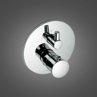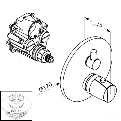 Смеситель с ограничением температуры воды при 38`С - внешняя монтажная часть - термостатический элемент - керамический запорный вентиль - переключатель душ/ванна - ограничитель температуры воды при 38`С - класс расхода воды BB - класс шума II
