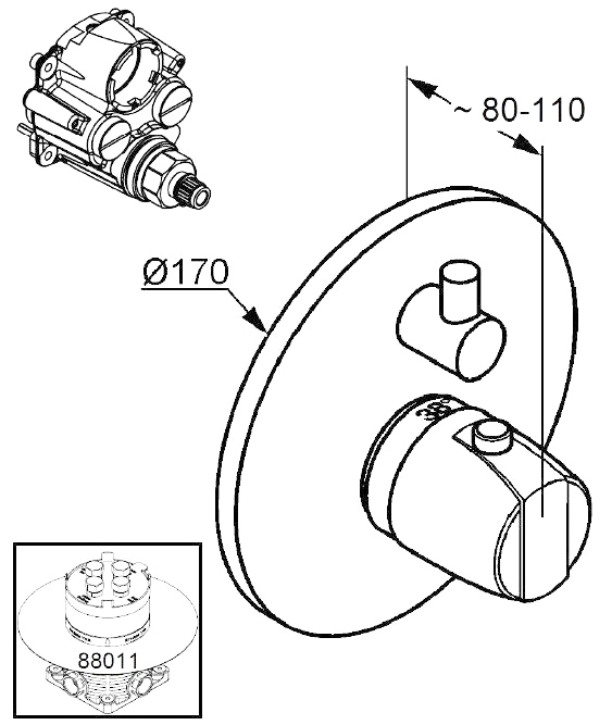 *арт. 358350538 - Смеситель для душа Kludi Objekta - внешняя монтажная часть - термостатический элемент - керамический запорный вентиль - ограничитель температуры воды при 38`С - класс расхода воды BB - класс шума II