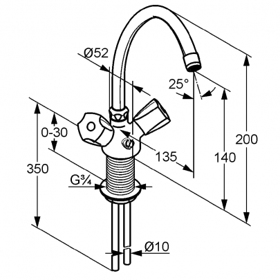 * арт. 210580515 - Смеситель для умывальника Standard - двухвентильный - поворотный трубчатый излив - резьба на изливе G 3/4 - монтаж на одно отверстие - аэратор M 22x1 - держатель для цепочки - жёсткая подводка 10мм - класс расхода воды A - класс шума I