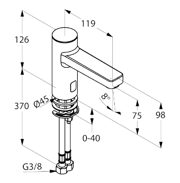 *арт. 3820205 - Смеситель с электронный для умывальника Kludi Zenta - монтаж на одно отверстие - расход воды 5 л/мин. - каскадный аэратор M 24 x 1 - электромагнитный клапан картриджа - предварительная установка температуры воды - оптический датчик движения - электронный модуль - питание от сети 230V - защита от обратного тока воды - система быстрого монтажа - гибкая подводка G 3/8