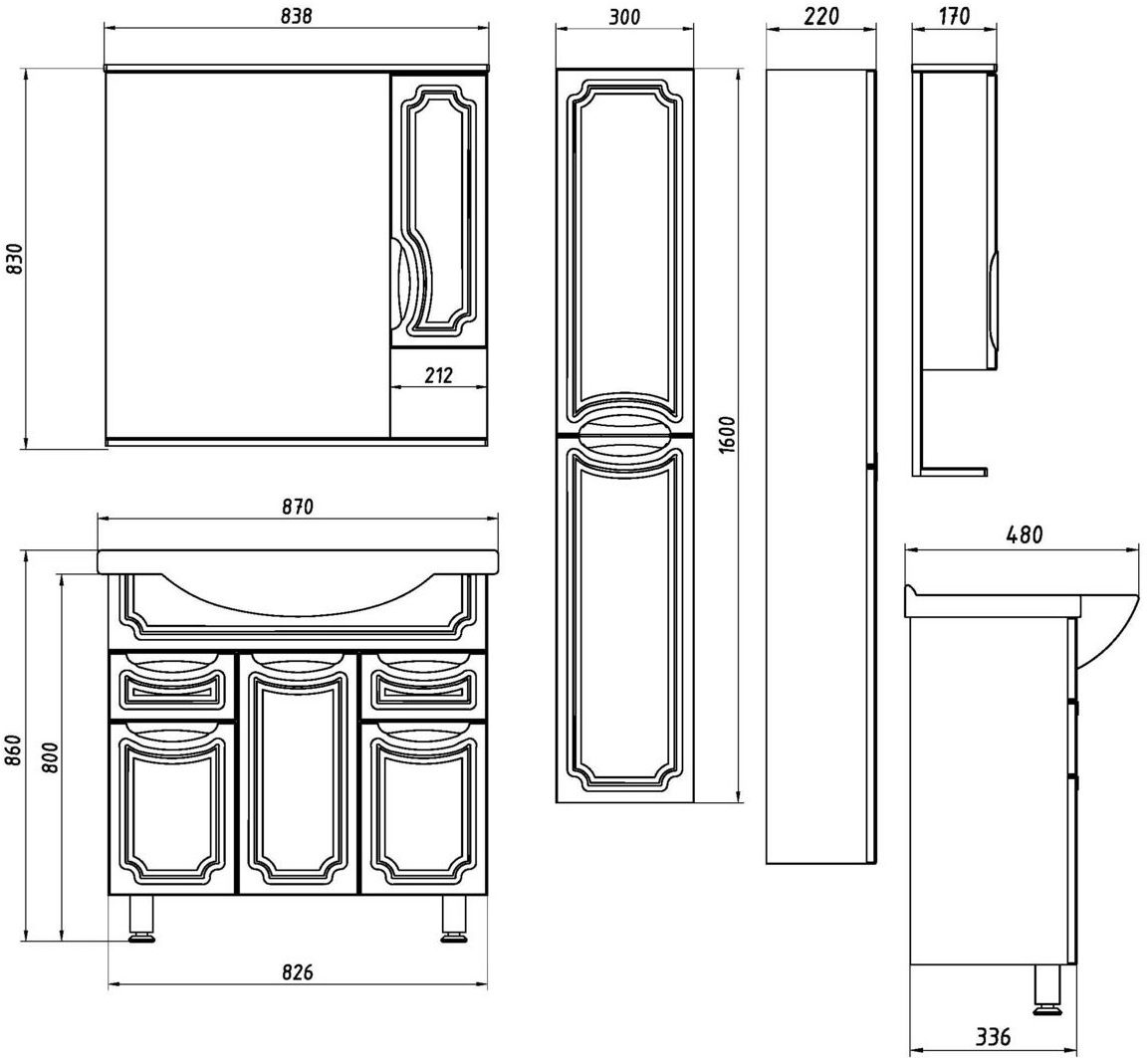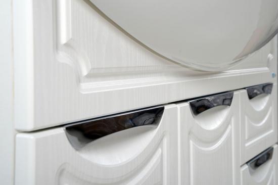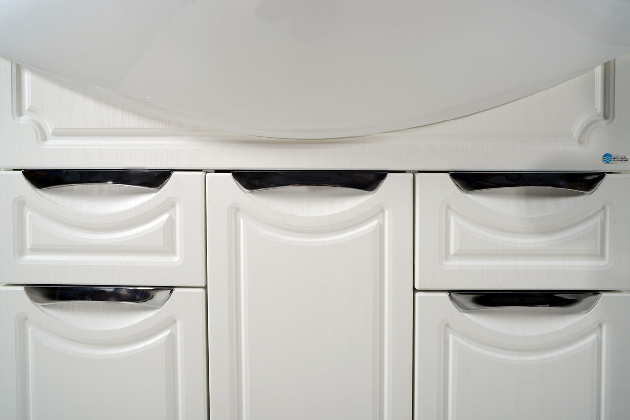 * Тумба с тремя дверцами и двумя ящиками * Зеркальный шкаф с нижней полкой, козырьком, галогенным светильником и выключателем * Надёжная фурнитура обеспечивает плавное закрывание дверей * Колонка с возможностью перевешивания дверей (лев/прав) * Материал фасада: МДФ 19 * Покрытие фасада: эмаль, пленка * Материал корпуса: ДСП 16 * Цвет: белый глянец