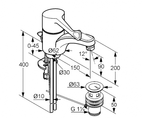 *арт. 341150534 - Смеситель для умывальника Medi Care, хром - Care-рычаг - монтаж на одно отверстие - регулировка открытия/закрытия воды по горизонтали - Care-аэратор M 24x1 - безопасный керамический катридж с ограничителем горячей воды - система быстрого монтажа - неповоротный излив - жёсткая подводка 10мм - донный клапан G 1 1/4 - класс расхода воды Z - класс шума I