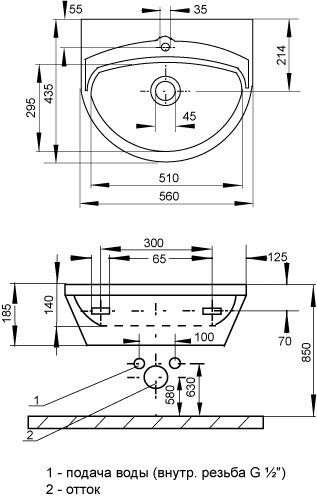 *Спецификация поставки: SLUN 01 - арт. № 93010 - нержавеющий умывальник с отверстием для смесителя, перепад, крепежный комплект
