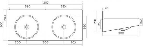 - Материал: нержавеющая сталь 304 AISI - Поверхность: матовая - Без отверстия под смеситель - Монтаж: настенные монтажные кронштейны, интегрированные системы крепления (с каждой стороны и между раковинами) - Цельная стеновая панель, дренажные отверстия - Рекомендуемая высота установки: 900 мм от пола до верхней части раковины - Внешние габариты: 1200х500х290 мм - Размер чаши: Ø360х130 мм - Вес: 15,5 кг