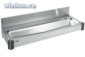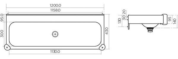 * Материал: нержавеющая сталь 304 AISI * Поверхность: полированная * Без декоративной стеновой панели * Одна раковина, незначительный уклон к сливу посередине, открытый сток * Без отверстия под смеситель * Монтаж: интегрированный крепеж к стене * Рекомендуемая высота установки: 850 мм от пола до верхней части раковины * Внешние габариты: 1200х430х140 мм * Размер чаши: 1130x300х140 мм * Вес: 7,37 кг