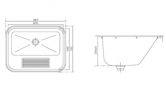 *Раковина встраиваемая арт. 705000200 для ручной стирки Характеристики: - Материал: нержавеющая сталь 304 AISI - Поверхность: полированная - Монтаж: встраиваемая, монтажные скобы - Без поддона для слива воды - Слив: Ø52 мм - Внешние габариты: 660х510х250 мм - Размер чаши: 600х450х250 мм - Объем: 47 л - Вес: 6,7 кг