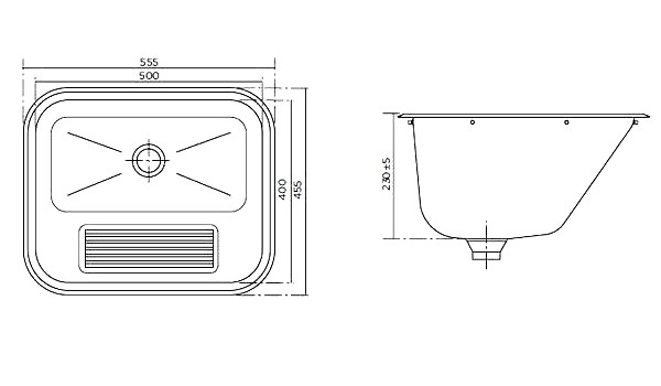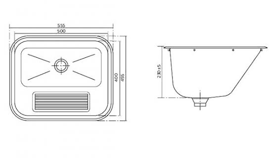 *Раковина встраиваемая арт. 705010200 для ручной стирки Характеристики: - Материал: нержавеющая сталь 304 AISI - Поверхность: полированная - Монтаж: встраиваемая, монтажные скобы - Без поддона для слива воды - Слив: Ø52 мм - Внешние габариты: 555х455х230 мм - Размер чаши: 500х400х230 мм - Объем: 34 л - Вес: 3,22 кг