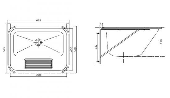 *Раковина подвесная арт. 705040200 для ручной стирки Характеристики: - Материал: нержавеющая сталь 304 AISI - Поверхность: полированная - Монтаж: к стене, кронштейн из нержавеющей стали - Рекомендуемая высота установки: 900 мм от пола до верха раковины - Внешние габариты: 655х530х250 мм - Размер чаши: 600х450х250 мм - Объем: 47 л - Вес: 6,11 кг