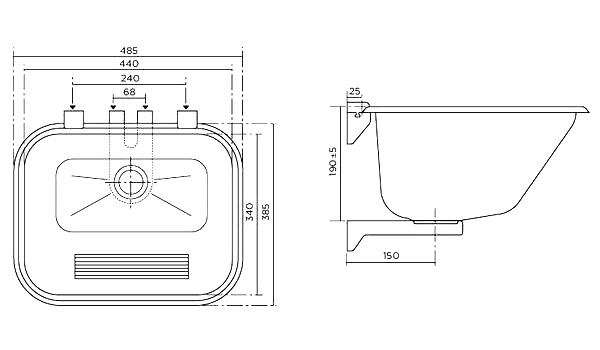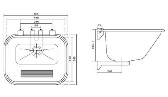 *Раковина подвесная арт. 705080200 для ручной стирки Характеристики: - Материал: нержавеющая сталь 304 AISI - Поверхность: полированная - Слив Ø52 мм - Монтаж: к стене, интегрированный крепеж - Рекомендуемая высота установки: 900 мм от пола до верха раковины - Внешние габариты: 485х385х190 мм - Размер чаши: 440х340х190 мм - Объем: 22 л - Вес: 2 кг
