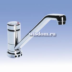 реагирует на присутствие рук в чувствительной зоне до 0,3 м. от датчика немедленным пуском воды
