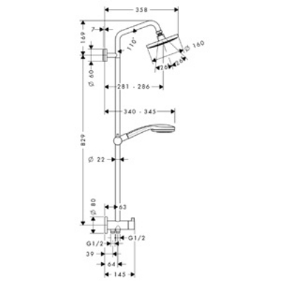 - переключающий вентиль ручной душ/верхний душ - верхний душ Croma 160 мм с защитой от загрязнений QuickClean (арт. 27450000) - ручной душ Croma 100 Vario (арт.28535000) - шланг Isiflex 1,60 м 1/2 (арт. 28276000) - шланг Isiflex 0,8 м 1/2 для подвода воды - регулируемый по высоте держатель душа - прокладка для крепления штанги на плитку 7 мм (арт. 95239000)
