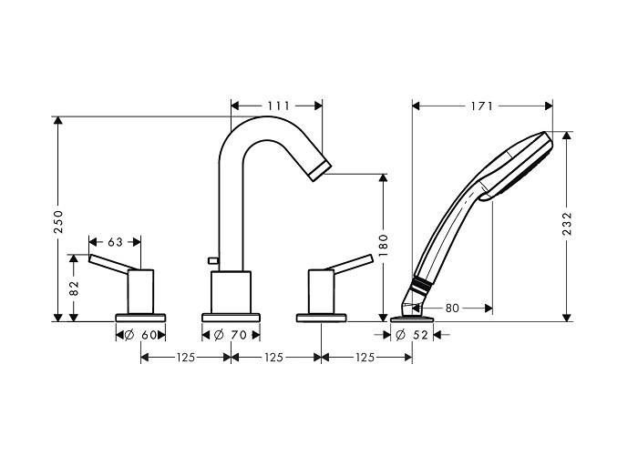 В набор входят: излив, переключающиеся вентили и розетки, вытяжной ручной душ Croma Е 100 Vario
