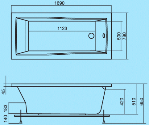 *Форма - прямоугольная *Слив-перелив во всех комплектациях *Фронтальный экран во всех комплектациях *Габариты - 169х78х65 см *Материал - сантехнический акрил *Объем - 380 л. *Цвет белый
