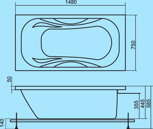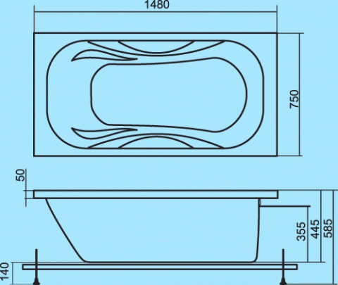 Форма - прямоугольная *Слив-перелив во всех комплектациях *Фронтальный экран во всех комплектациях *Габариты - 148х75х58.5 см *Материал - сантехнический акрил *Объем - 220 л. *Цвет белый
