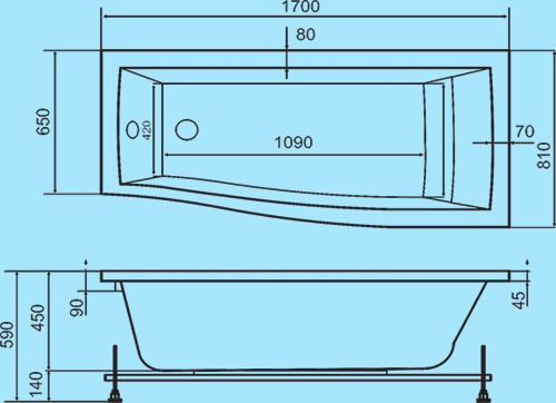 Акриловая ванна Osm Медея 170 *Форма - ассиметрическая *Слив-перелив во всех комплектациях *Фронтальный экран во всех комплектациях *Габариты - 170х81х59 см *Материал - сантехнический акрил *Объем - 280 л. *Цвет белый