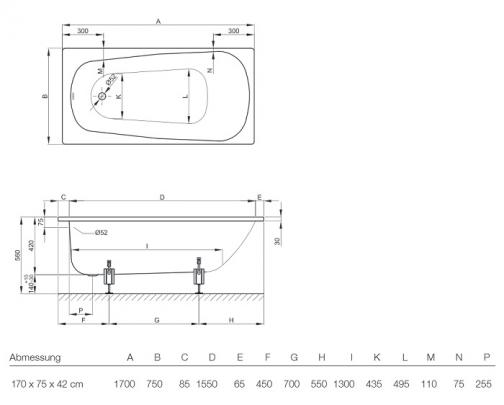 *Габариты (ДхШхГ): 170x75x42 см *Длина места для лежания: 1300 мм *Слив: посредине ∅52 мм *Объем: 120 л *Звукоизоляция в комплекте *Покрытие: эмаль *Цвет: белый