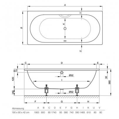 *Габариты (ДхШхГ): 190x90x42 см *Длина места для лежания: 1465 мм *Слив: посредине ∅52 мм *Объем: 205 л *Звукоизоляция в комплекте *Покрытие: эмаль *Цвет: белый
