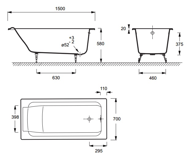 арт. E2946-00 — чугунная ванна без отверстий для ручек