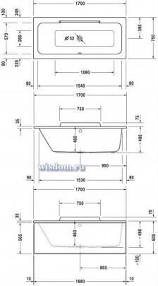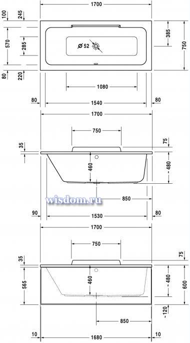 * Форма: прямоугольная * Наклон для спины слева * Тип: встраиваемая или с панелями * Материал: санитарный акрил 5 мм * Ёмкость: 170 л * Вес: 30 кг