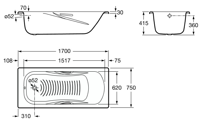 * Артикул: 2202E0000 * Материал: сталь * Вместимость воды: 215 л * Форма: прямоугольная * Количество людей: 1 * Внутренняя высота: 415 мм * Внутренняя длина: 1517 мм * Внутренняя ширина: 620 мм * Конструкция для монтажа: без каркаса * Тип установки: врезной * C противоскользящим покрытием и звукоизоляцией * Без слива-перелива (приобретается отдельно)